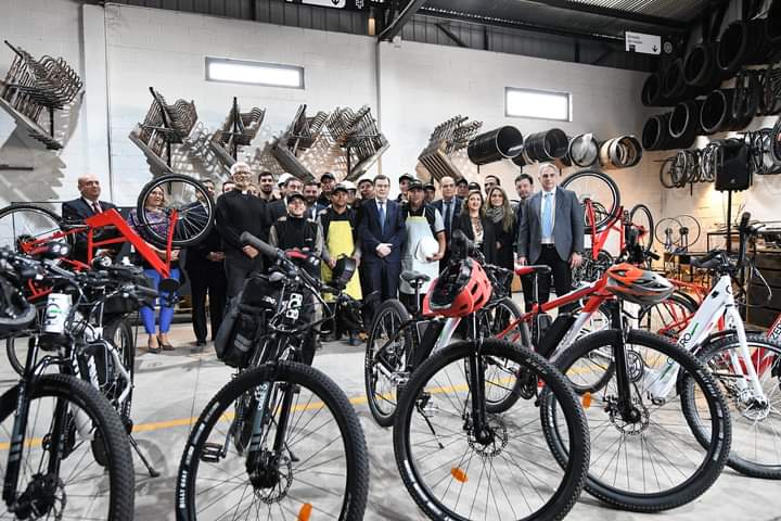 Durante el recorrido el gobernador estampó su firma en la caja de la primera bicicleta oficialmente embalada para la venta en la fábrica E-Zero, que ya comienza a comercializar un producto novedoso en toda la región.