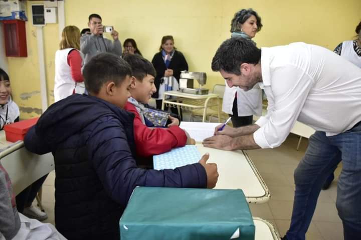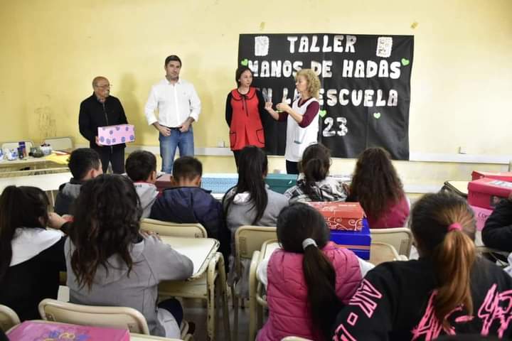Esc. N° 201, República de Guatemala, donde tambien realizó la entrega de materiales, los cuales tuvieron como destino al «Taller Manos de Hada» que se dicta a alumnos de 7° grado, a cargo de la Prof. Soledad Perez.