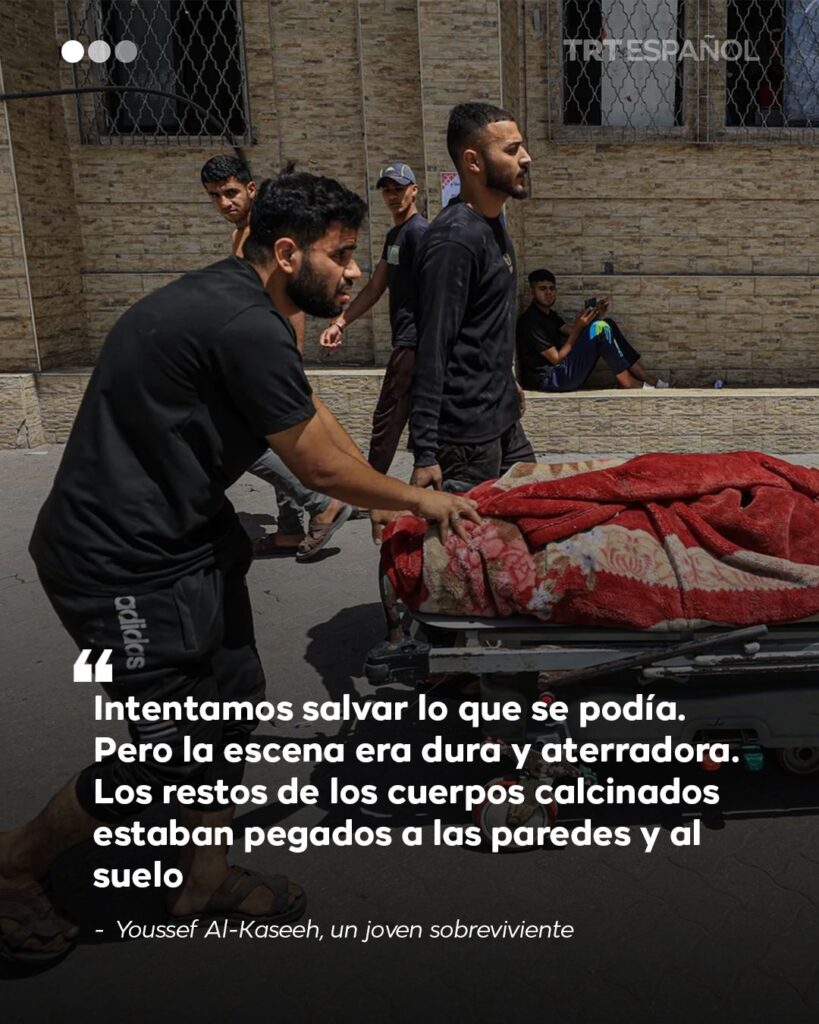 Testigos describen una escena devastadora: gritos ahogados por el fuego, cuerpos calcinados pegados a las paredes y un silencio desgarrador tras las llamas. «El fuego fue más rápido que nuestras voces», dijo Nawal, vecina del lugar. «¿Cómo pueden decir que esto no es un crimen de guerra?»